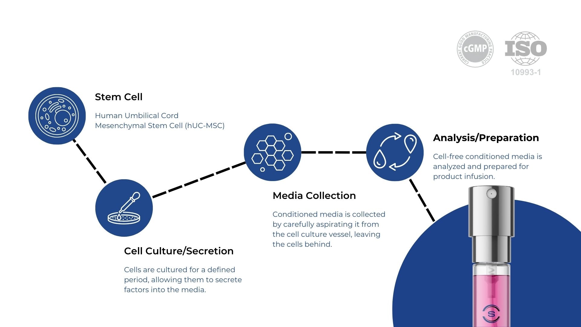 Mesenchymal Stem Cells derived from the human umbilical cord tissue (hUC-MSC) are considered the richest and most effective source of MSCs. Studies have shown that hUC-MSCs have several properties that make them ideal for use in anti-aging and cell regenerative therapy. They secrete various growth factors and cytokines that significantly improves tissue regeneration, reduce inflammation, and promote cell proliferation. Additionally, hUC-MSCs can help enhance angiogenesis, the formation of new blood vessels, which is crucial for maintaining healthy tissue and combating age-related diseases.