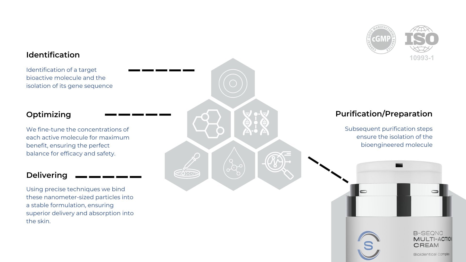 Nanotechnology is at the core of our bioidentical (B-SEQNC) formula. It involves the use of nano-sized particles or structures (nanoparticles) to enhance the effectiveness and delivery of active ingredients in skincare formulas. These nanoparticles typically range from 1 to 100 nanometers in size, which is incredibly small, allowing them to penetrate the skin's surface and target specific areas more efficiently. The nanoparticles are designed to encapsulate active ingredients, such as vitamins, antioxidants, peptides, and other bioactive compounds. Encapsulation helps protect the active ingredients from degradation and ensures controlled release, increasing their stability and effectiveness.